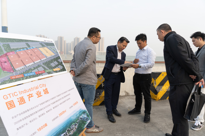 肇庆市高要区委书记陈德培(左二)与国通集团总裁兼品珍国际控股创始人陈健涛(中)探讨产业园区相关问题